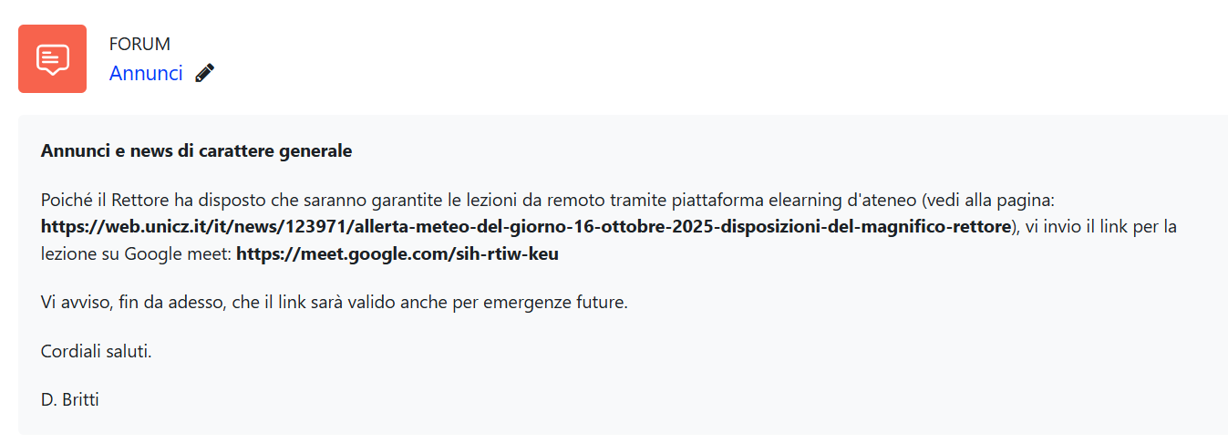 In allegato l'avviso pubblicato dal Prof. Britti sulla piattaforma e-learning
