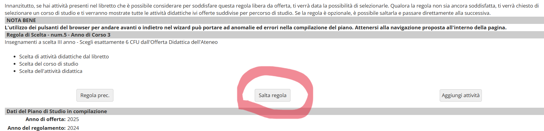 Pertanto sono invitati ad avviare la procedura, arrivati all'ultimo passaggio, dove chiede di inserire le scelte per il 3° anno, va cliccato su "SALTA REGOLA" procedendo così con la conferma definitiva del piano.
